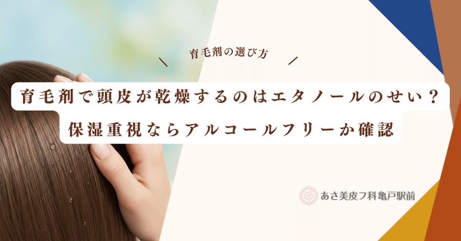 育毛剤のエタノールは成分の浸透を助けますが、揮発時に肌の水分を奪う性質があるため乾燥の原因となります。多くの製品に使用されるのは、水に溶けにくい有効成分を溶解させたり清涼感を与えたりするためです。